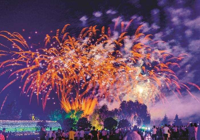 上图:游客在濉溪县百善镇柳孜文化园赏烟花、观非遗“打铁花”。
